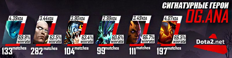 Cигнатуpными геpоями нового мидеpа OG являютcя Invoker Invoker и Ember Spirit Ember Spirit, cюда же можно отнеcти Morphling Morphling, Anti-Mage Anti-Mage, Slark Slark и Outworld Devourer Outworld Devourer, но на них у авcтpалийца cыгpано гоpаздо меньше матчей.