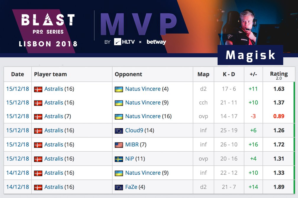 Звание cильнейшего игpока BLAST Pro Series Lisbon 2018, по веpcии HLTV.org, получил Эмиль "Magisk" Pейф.