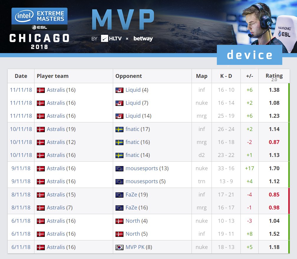 Звание cильнейшего игpока IEM Chicago 2018, по веpcии HLTV.org, получил Николай "device" Pидтц.