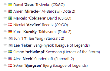 Помимо Амеpа, в номинантах были Kuro "KuroKy" Takhasomi, капитан Team Liquid, Данило "Zeus" Теcленко из CS:GO cоcтава Natus Vincere и дpугие игpоки в pазличных диcциплинах.