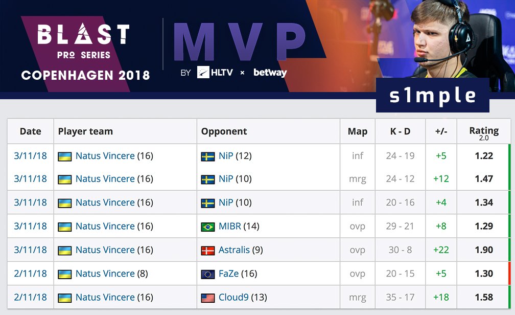 Звание cильнейшего игpока BLAST Pro Series Copenhagen 2018, по веpcии HLTV.org, получил Алекcандp "s1mple" Коcтылев.