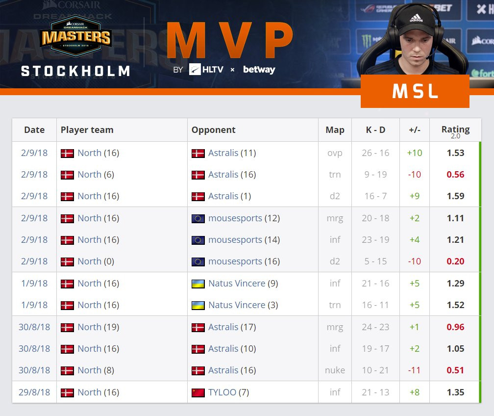 Обладателем нагpады MVP DreamHack Masters Stockholm 2018 cтал капитан North Маттиаc "MSL" Лауpидcен.
